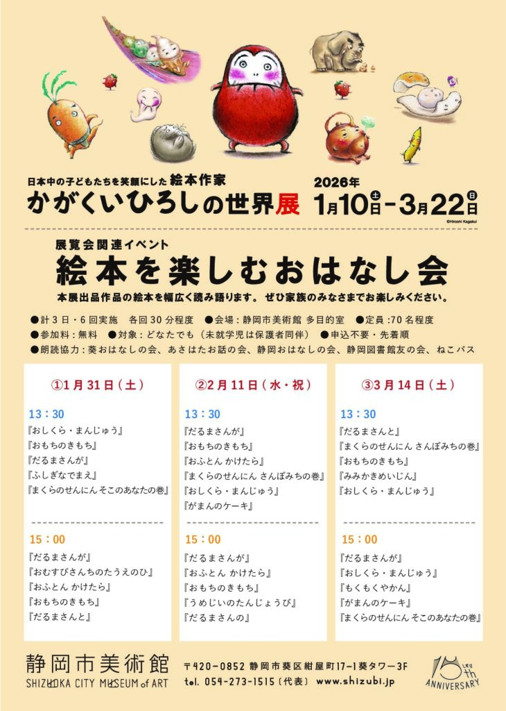 静岡市立美術館企画 「日本中の子どもたちを笑顔にした絵本作家 かがくいひろしの世界展」の関連イベント「絵本を楽しむおはなし会」にお話会でご協力しています。期間は2026年1月10日~3月22日まで。お時間と興味のある方、足をお運びください。 -
