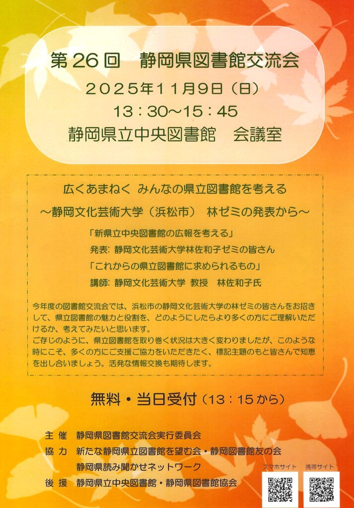 第26回静岡県図書館交流会広くあまねく みんなの図書館を考える~静岡文化芸術大学(浜松市)林ゼミの発表から~2025年11月9日(日)13:30~15:45於 静岡県立中央図書館 会議室入場無料・当日受付(13:15から) -